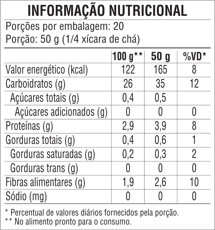 * Valores diários de referência com base em uma dieta de 2.000 kcal, ou 8400 kj.
